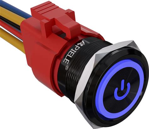 APIELE 22mm Latching Push Button Switch 12V 10A Power Symbol Ring Led Car Metal With Socket Plug 1NO1NC DPST ON/Off 0.87" 1 Pack (Black Shell, Blue)