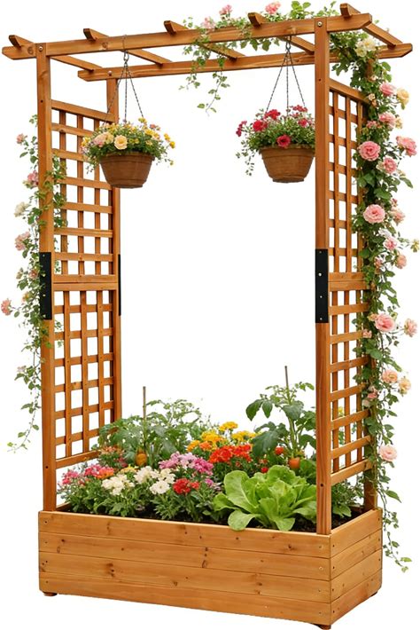 Raised Garden Bed Wooden Patio Planter With Trellis Outdoor Climbing Cucumber Box Pots Tomato Flower Vegetable Herb Porch, Tall Hanging Roof, Orange,
