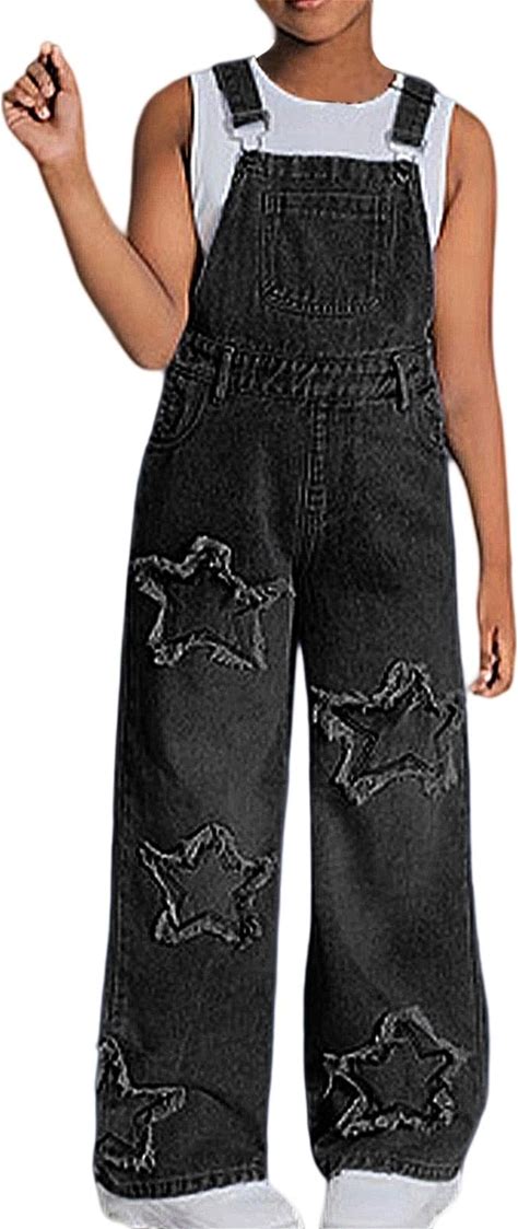 Girls Denim Bib Overalls Star Patchwork Straight Leg Adjustable Straps Stretchy Jean Dungarees Pants With Pockets 8-13Years