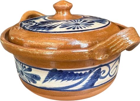 Traditional Mexican Barro Bean And Chili Pot - Handcrafted Clay Pot, 10 Inches Wide, Stovetop & Oven Safe, With Blue Accents - Perfect For Cooking And