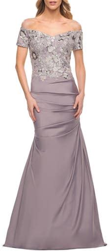 La Femme Satin Mermaid Gown With Off The Shoulder Lace Bodice In Silver At Nordstrom, Size 12