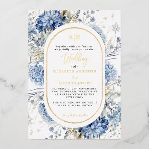 Navy Dusty Blue Gold Floral Spring Bloom Wedding Foil Invitation