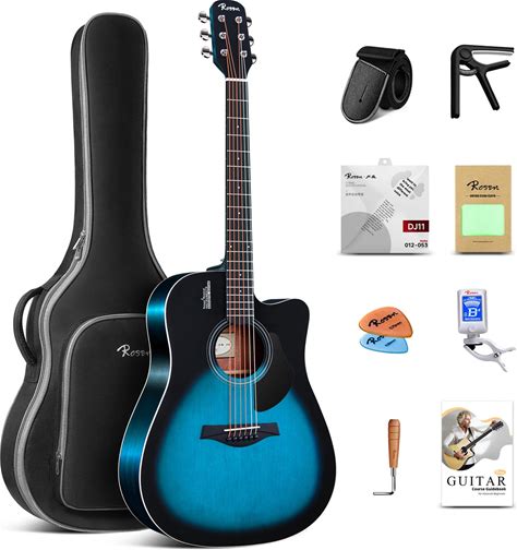 Rosen Solid Top Dreadnought Acoustic Guitar 41 Inches Spruce Guitar Beginner Bundle With Book, Padded Bag, Strings, Picks, Hexwrench, Strap, Polishing