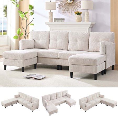 Balus 87" Convertible U Shape Sectional Sofa With 2 Moveable Ottomans, 6 Seat Modular Sectional Couch For Living Room/ Apartment, Corduroy, Beige