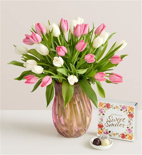 Sweet Spring Tulip Bouquet 30 Stems With Pink Vase & Chocolate | 1-800-Flowers Flowers Delivery